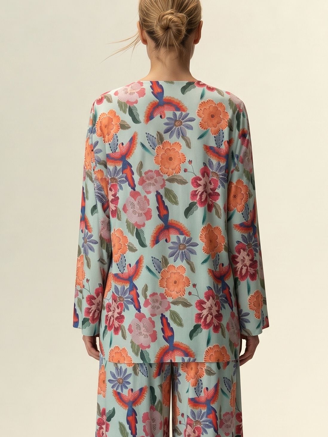 Лёгкий пляжный лонгслив из полупрозрачной сетки с ярким принтом.