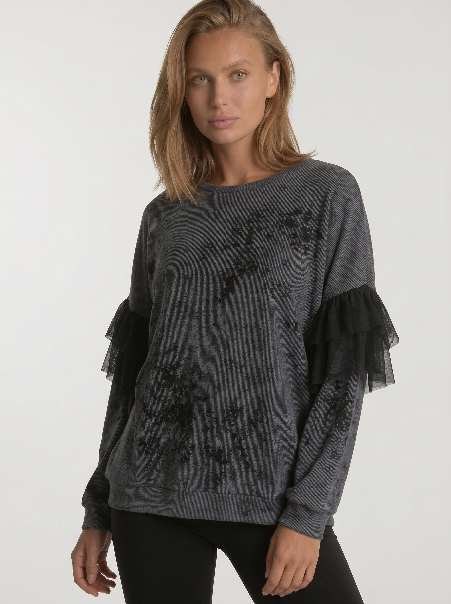Лёгкий оверсайз силуэт обеспечивает комфорт и свободу движений, а декоративные сетчатые вставки на рукавах добавляют образу современную женственность. Идеален для стильных повседневных образов